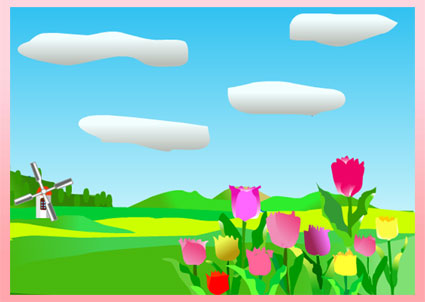 春の高原風景を描きました。クリックすると、画像が動きます。チュウリップを3層に分けて、色付けしました。楽しく作業できました。 |