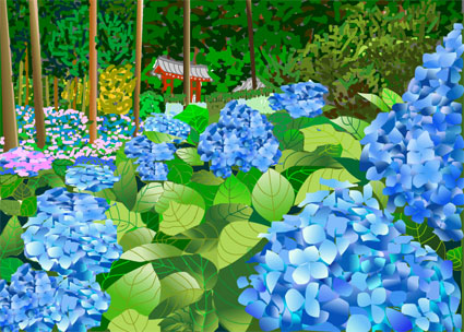 宇治の三室戸寺の紫陽花です。ブルーの濃淡を描くのが難しく先生にお世話になりました。奥の木立、山門、手前の花と葉っぱ。何層にも分けての作業は手間がかかりますが、面白いものでした。初夏の風をお届けします。 |
