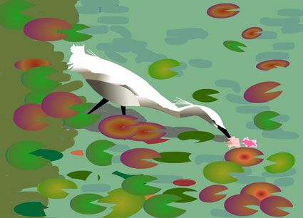 天王寺公園内の慶沢園の池の鷺です。威儀を正してシャッキと澄ましていた鷺。カメラでパチリ。次の瞬間、首を伸ばして獲物をついばむ鷺をまた、パチリ。水や蓮の色合いや影のつけ方を先生に教わりました。写真をフラッシュ画にすることは奥が深いものです。 |