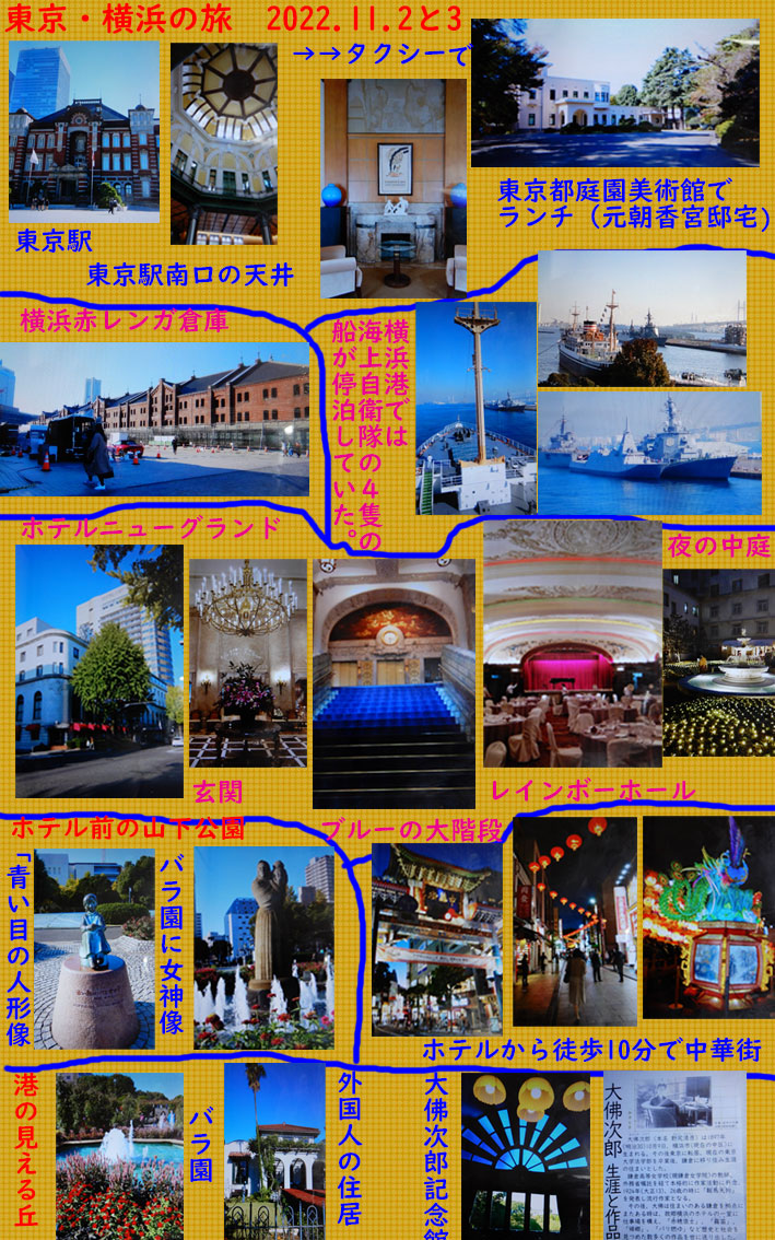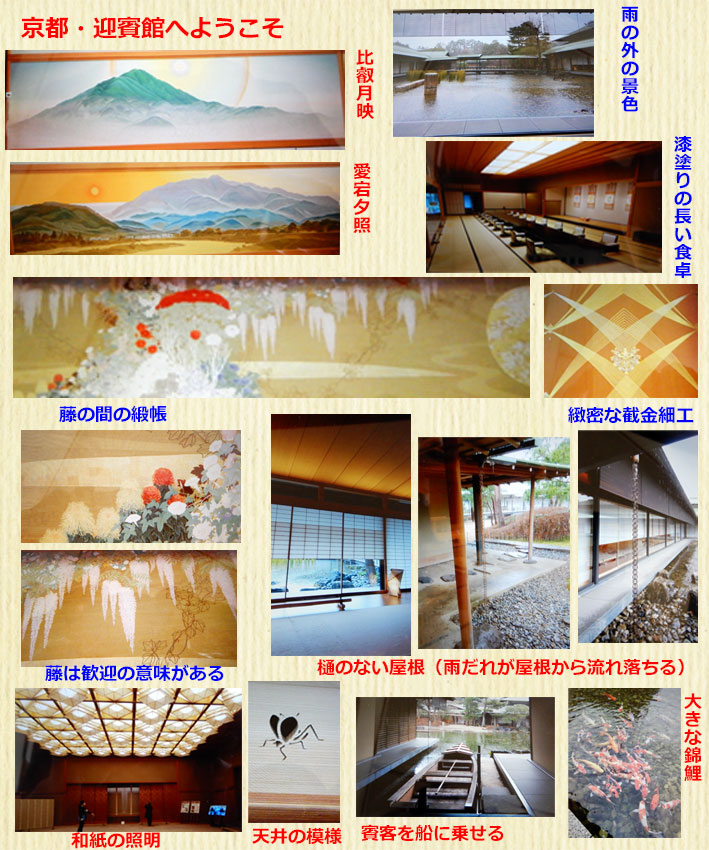 まず地下のコインロッカーにスマホ以外の荷物を入れ、いざ出発。たった2人の参観者に2人の案内人。年間訪問される賓客10組程度。賓客のある時は休館。日本工芸の粋を集めた焼き物・漆塗り・竹細工などなど。一流の品で目を楽しませていただきました。70分コース。疑問点①日本家屋に樋がない➡雨だれが落ちる風情を楽しんでもらうため②「藤の間」の緞帳の制作日程➡「川島織」の熟練の織り子15人が横1列になって1年半かかった。③宴会用の長いテーブル➡1枚板で横1列に10人座れる長テーブル。黒光りしている漆塗り。職人の技。掘りごたつ形式になっていて、足を入れて座れるようになっている。④和紙の照明は36通りに変化➡ボタン操作で36通りに照明が変化させられるとのこと。⑤截金細工(きりかねさいく)➡仏様の模様として金箔を竹の刀で切り、貼り合わせていく繊細な技術。 |