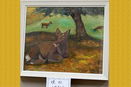 油絵教室の仲間と奈良へ題材を探しに行きました。あまり知られていないのですが、東大寺の北西に大仏池があります。銀杏の紅葉が有名な場所。黄色い銀杏の絨毯の上に、くつろぐオスの鹿。角は切り取られています。奥の野原に見えている所は、本来ならば水をたたえた大仏池ですが、水量が少なく、草をはむ鹿がいました。私はそののどかな風景が気に入っています。 |