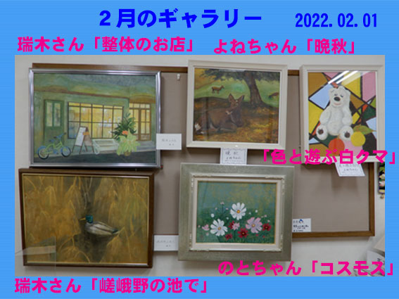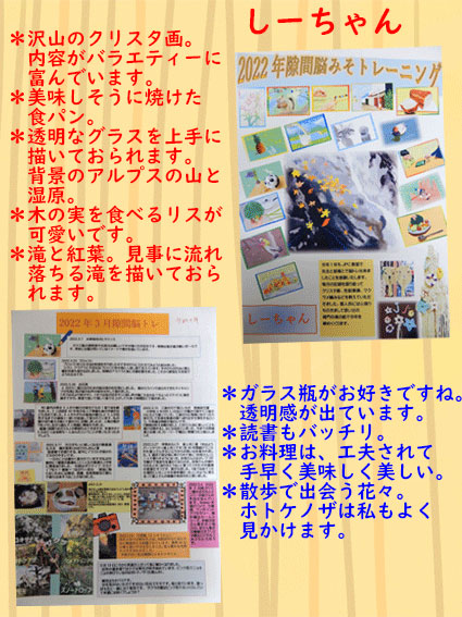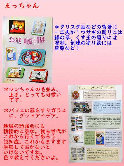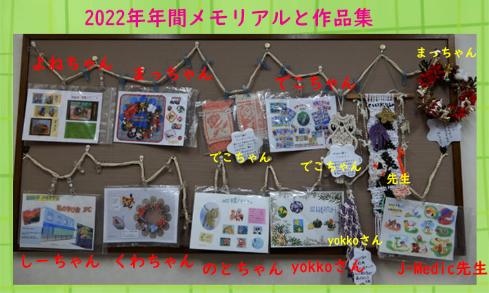 | *先生:12支をクリスタ画で描かれています。虎がボールを蹴ろうとしています。ウサギがニンジンを抱えてスタコラさ。可愛い表情が何とも言えません。マクラメ編みでクリスマスツリー。飾りもマクラメ編みです。*yokkoさん:お花のクリスタ画が一杯(ハイビスカス・ユリ・カラー)。どっしり2つのカボチャ。表紙の周りが華やかな草の模様で額縁の様です。千鳥格子柄のマクラメ編み。*のとちゃん:大きな虎がリアルに描かれています。のそのそ迫ってくる迫力。カニが秀逸!*くわちゃん:手作りリースを茶色の背景で。リースの赤色が際立ちました。虎とウサギの布細工。バトンタッチの言葉が面白い!*しーちゃん:「私の学び舎」がクリスタ画で登場。突然のけがで11月は欠席。本人は勿論メンバーの私たちも寂しい思いをしました。「早く元気になーれ」*でこちゃん:アオサギの周囲を取り囲む本、本。読書の量がすごい!きっちり編まれたマクラメ編み。ふくろうさんが見張ってるよ!*まっちゃん:リースを花柄で切り取り、背景にも工夫が凝らされています。大好きなうーちゃん(11月に天国に!ウルウル)丸シールの富士山。可愛いワンちゃんのクリスタ画。*よねちゃん:くす玉に鶴や几帳結びの飾りを付けてにぎやかに!油絵の鹿ちゃんの目線。何を見ているのかな?毎日世話している花たち。今は種類の違う菊が花盛り。 |