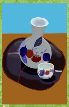 野菜の籠盛りです。玉ねぎの皮をむいて、変化をつけました。籠の表情も大事です。野菜のヘタを上手く描けるようになりたいです。そのためには「よく見ること」。以前の作品よりはましかな!? |