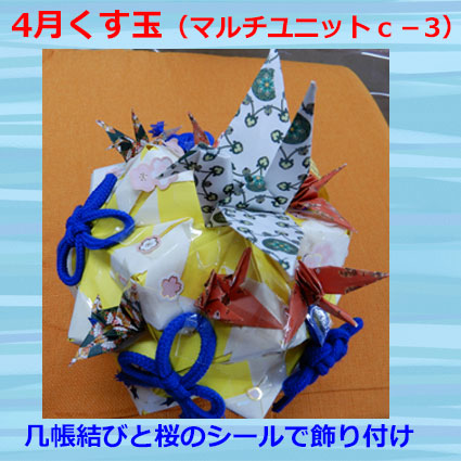 沢山のくす玉の折り方を習いました。今回はマルチユニットAの折り方。組み方が「3」なので、いつものくす玉より大きなくす玉になりました。飾り付けは几帳結びや玉結びなど。鶴を上に飾りました。シールは梅の模様です。 |