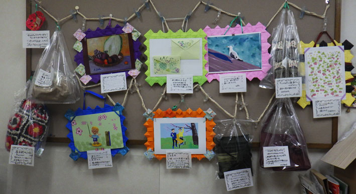 JPC教室の掲示板が華やかに彩られています。編み物がお得意の方は靴下、裁縫がお得意の方は小物入れやバッグ、クリスタ画を描かれている方もいらっしゃいます。奴さんで額縁を思い思いに作っておられます。初めて見た方から「わーすごい」の声を頂きました。 |