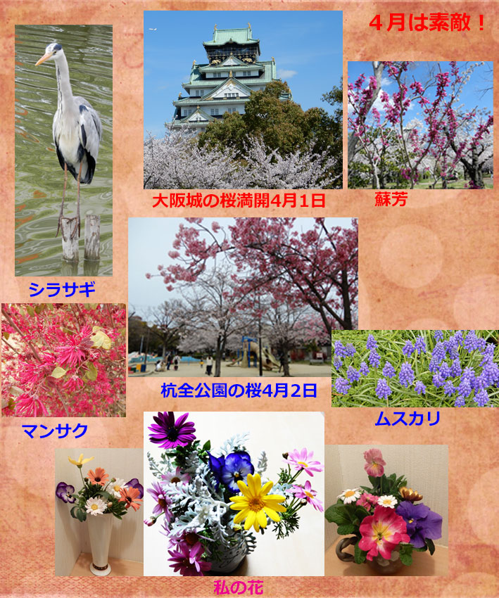 近所の杭全公園の桜も満開。マンサクの赤い花が可愛いです。ムスカリは近所の家の花。シラサギは杭全神社の参道の池にいます。餌を取ったり羽を広げたりしていました。