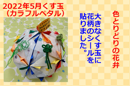 もう8月。今年は暑い暑い夏になりました。ソレイユは華やかなくす玉。はっきりしたメリハリのきいた一品です。色の組み合わせで、別なくす玉に見えるのも面白いものです。 |
