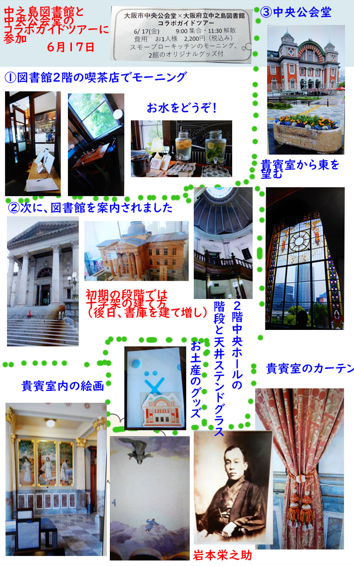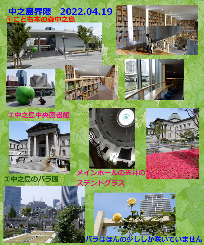 ①こども本の森安藤忠雄設計の施設。完全予約制. 9時30分から滞在時間は90分。地上2階、地下1階の施設。中に入った印象は、東大阪にある司馬遼太郎記念館にそっくり。天井まで本が並べられています。地下1階は映像が見られます。②中之島図書館 住友家が20万円を寄付して造られた。辰野金吾の弟子・野口孫市の設計。正面玄関は古代神殿を想像させる。メインホールはバロック様式を基調としたデザイン。市庁南のサツキの植え込みが美しい。③バラ園