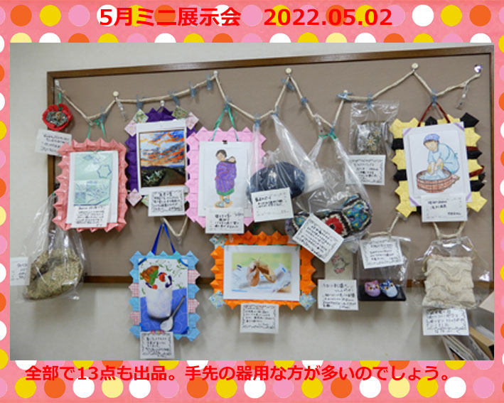 色んな作品が並んでいます。さて次はどんな作品にチャレンジしますか?と展示物が問いかけてくれているようです。先生(様々なマクラメ編みの作品・コースターやミサンガ・チャームなど)まっちゃん(シールを貼り付けた素敵な夜景)yokkoさん(涼し気なブルー系のつまみ細工)りりちゃん(使い勝手の良いマクラメ編みの手提げバッグ)よねちゃん(クリスタ画でパプリカとカボチャ)でこちゃん(赤系統のつまみ細工)ななふくさん(華やかなポーチ)のとちゃん(布を丁寧に貼り付けた宝石箱)しーちゃん(見事な野菜のクリスタ画とマクラメ編み作品) |