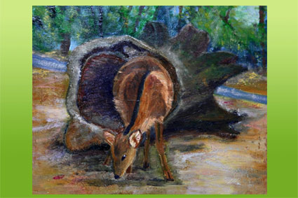 何時も描いているサイズの一回り上のサイズのキャンパスに、以前描いたことのある大木(春日大社参道の脇にある)を描きました。鹿は上を向いているほうが良いとの先生のアドバイスがありました。まだ若い鹿が遠くを見つめている、という設定にしました。背景の樹木をぼかすようにし、空洞の大木に力を入れました。鹿は短時間で描けました。ロマンを感じてもらうために、面白い題名にしました。 |