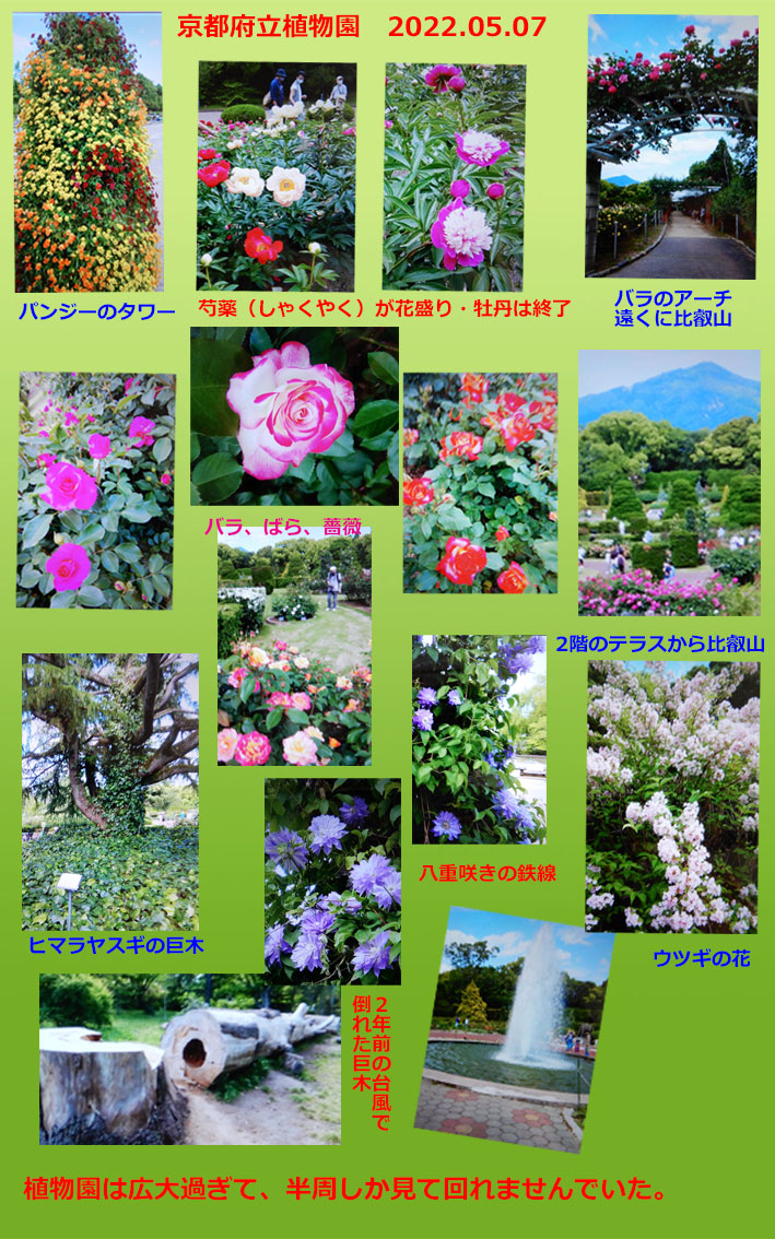 広大な敷地。若い時は1周見て回るのは苦になりませんでした。現在は、「半周にしておこう」と自分が自分に言い聞かせています。200円の入園料は65歳以上の証明書を提示すれば、無料に。入口に「牡丹は終了しました」の看板が!4月の暑さのせいでしょう。遠く・近くに比叡山の姿が見えます。2年前の台風の被害がここにも!大きな大木が無残にも倒れていました。八重咲の鉄線の花が珍しかったです。連休明けということで、人出はそう多くはありませんでした。 |