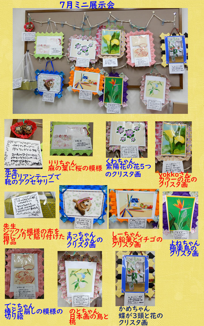 切り絵はでこちゃん(微妙な切り口のカッター遣い)クリスタ画はまっちゃん(冷菓・美味しそうなパフェ)しーちゃん(採れたての新鮮なタケノコ)塗り絵はyokkoさん(昔懐かしいねんねこ)かめちゃん(洗濯板を使ってのたらいでの洗濯)手芸作品はJ-M先生(ウイリアムモリス柄の手提げ袋とリボン刺繍)くわちゃん(縮緬の布で作ったふくろうのお手玉)ななふくさん(レース布で作った化粧ポーチ)のとちゃん(かぎ針編みのモチーフつなぎの枕カバー)りりちゃん(藍染のポーチ)かめちゃん(キルトのバッグ)よねちゃん(油絵・茜色の雲) |
