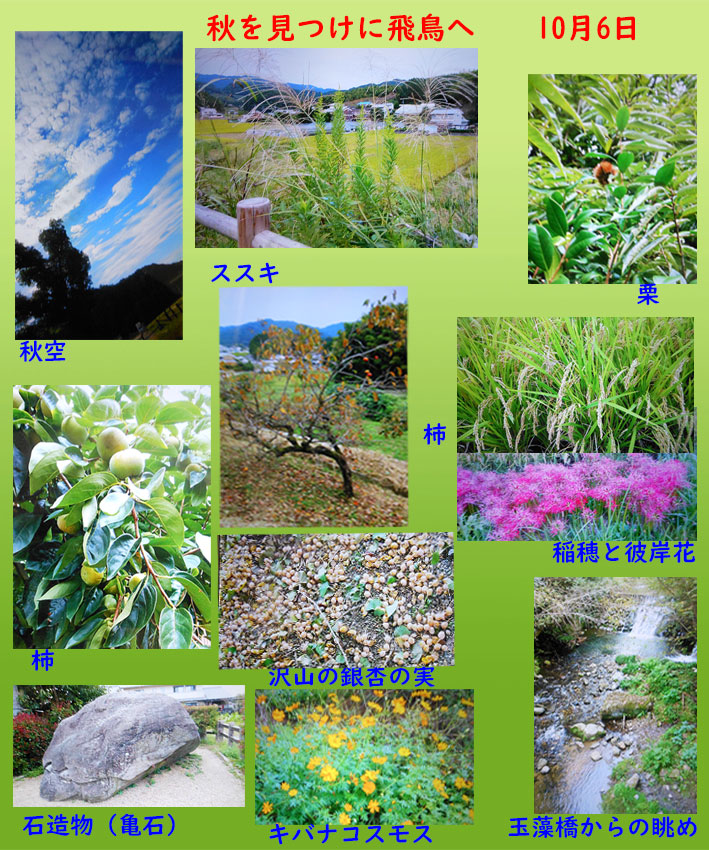 「飛鳥へ行きたい」という友人の希望で飛鳥へ。11時過ぎに飛鳥へ。いつものカフェでランチ。お客は10人位。ぶらぶら歩いていきました。空は鱗雲とすじ雲。すっかり秋です。ススキに栗に柿に銀杏。大阪にはない秋を見つけました。稲穂もたれ、刈り取っている田んぼもありました。残念なことに彼岸花は盛りを過ぎていていました。