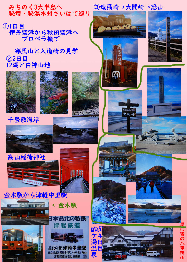 ②2日目 白神山地のブナ林の12湖へ。紅葉が盛りの林の中を散策。青いインクを垂らしたような青湖。千畳敷は殿様が千枚の畳を敷かせて宴会をしたとか。赤い鳥居で有名な高山稲荷神社。太宰治の生家から徒歩で6分の場所にある金木駅。「走れメロス号」の電車に14分乗車。津軽中里駅へ。③3日目 石川さゆりの歌が流れる竜飛岬。マグロで有名な大間崎。恐山は雪が深いので、11月からは入山出来なくなります。④4日目 ホテルから一路「酢ケ湯(すかゆ)温泉へ」。日本で一番古い湯治場だそうです。観光バス3台。多数の乗用車が駐車。沢山の温泉に入る方たちがいました。