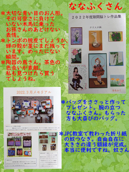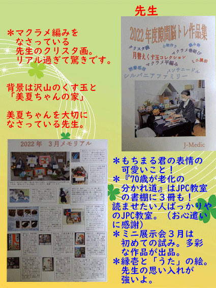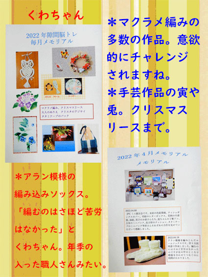 もう11月。メンバーさんたちはマクラメ編みに熱中されています。よねちゃん油絵で描いたトウモロコシの作品と来年のカレンダーまっちゃん丸シールで楽しむ富士山の絵(台紙を工夫なさっています)カレンダーと手帳でこちゃんマクラメで作ったポシェットとタペストリー(しっかり編み込んでおられます。)しーちゃん巨大なマクラメ編みのクリスマスツリー(飾りの品々もマクラメ編みです)くわちゃんボケ防止手帳とペンケース(手帳はシックな茶色・リボン刺繍が美しい)ふくろうの壁飾り(リアルなふくろうがマクラメ編みで再現)yokkoさんマクラメ編みのコースター(色を変えてクルクルと・奇麗な色の仕上がりに)ななふくさん双子のパンダの羊毛フェルト作品(愛らしい表情が出ています)先生ボケ防止手帳・マクラメ編みの作品3点(さすがバラの花のコースターは美しい!)のとちゃんボケ防止手帳と手帳とマクラメで編んだミサンガ(手帳の布カバーは来年の干支のうさぎです) |
