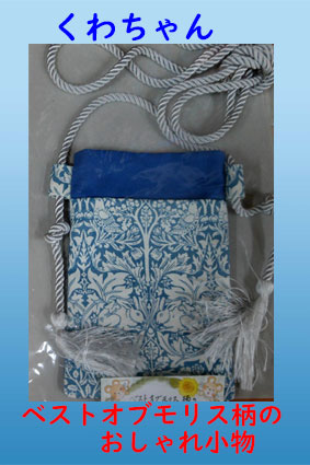 | 袋物はお手の物のくわちゃんですが、タッセル作りには苦労なさいました。紐の撚りを戻すのに蒸気をかけて伸ばす作業。根気がいったことでしょう。ブルーのウサギと鳥のモリス柄が上品。 |