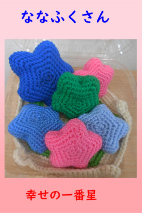 「幸せの一番星」が大小6個も!敷物も細編みで編んだ立体的なもの。編み物上手なななふくさん。きっちり奇麗に編み目が揃っています。ピンク・緑・水色の毛糸は、幸せ色なのでしょうね。 |